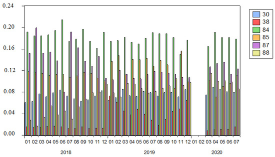 Figure 5 shows the share of the products in the total imports of China from the EU-15. We chose the products with the codes 38, 88, 30, 84, 85, and 87 because their shares are 5% or higher in at least one month. The label of the codes can be seen in the Appendix A. For simplicity, we use pharmaceutical products for 30, chemical products for 38, machinery for 84, electrical machinery for 85, vehicles for 87, and aircraft for 88.