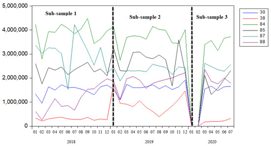 Figure 3 shows the increase or decrease in the share of the products by month. Except for apparel knitted, all articles had at least one 5% share. In the figure, we can identify machinery and electrical machinery from the right axis and the rest of them from the left axis. However, we present Figure 3 here to show why we have chosen these products. For detailed research, we use the values of the products instead of their shares.