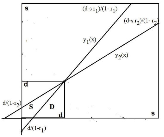 Finally, note that and rotate towards the diagonal as Let us suppose that and are such that the lines are as in Figure 2. The intercepts of the first line are and and those of the second line are and