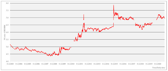 CHF/HRK FX mid-rate movement, daily data for the 11 February 2003–3 December 2020 period. Source: Author’s presentation of Bloomberg data.