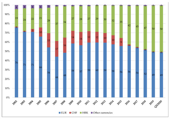 The FX loans (including loans denominated in foreign currency and loans indexed to foreign currency, i.e., loans with FX clause) are a ubiquitous practice in the Croatian banking sector (Figure 2). In the 2002–2015 period, loans indexed or approved in euros had an average proportion of nearly 60%, while those in the Croatian kuna amounted to around 28%. Loans indexed to Swiss francs were atypical for the domestic banking sector before 2004 when their rapid growth started, reaching the maximum value of 17% in 2007. The downward trend, which began the same year, has continued since, with the legislative solution of the CHF debt crisis almost squeezing them out of the bank’s balance sheets from 2016 onward. Between 2004 and 2015, they amounted to approximately 12%. In the last 5 years, loans in Croatian kuna have significantly increased their portion in the banking sector placements. However, this has been driven mainly by a flourish of non-housing consumer loans, i.e., general purpose cash loans, which are extremely popular even at present due to a poor credit capacity of the Croatian household sector as well as low level credit standards required for the approval of these loans.