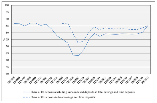 Concerning the euro prevalence in bank balance sheets, it is well known that euro is the dominant currency choice for savings and time deposits in Croatia. Low confidence in the domestic currency and high inflation sentiment is linked to a history of several hyperinflation episodes (Sorić and Čižmešija 2013). Regardless of the price stability for a number of years, cognitive biases such as conservatism bias (which causes anchoring and adjustment heuristics), as well as association and availability heuristics are all still present (Ivanov 2009, p. 18; Sorić and Čižmešija 2013). Consequently, FX loans and savings decisions are mutually determined with an insufficiently credible domestic monetary authority (Koški 2012). Thus, despite deposit interest rates being quite higher for savings in the Croatian kuna, economic agents keep their money in euros. Moreover, even two decades since the last Croatian banking crisis, there is a significant propensity towards the non-income earning cash savings at home in euros, i.e., more than 1/3 of the interviewed population as disclosed in Stix 2013. Namely, as in many other emerging European countries, cash savings are driven by a lack of trust in banks and deposit insurance institutions due to past banking sector problems, as well as by an informal economy issues (Stix 2013). On the other hand, public knowledge about the banking supervision, deposit insurance as well as financial consumer protection is far from perfect in even more developed European economies and democracies (van der Cruijsen et al. 2013). Briefly, the level of euroization in Croatia remains sizeable even if excluding liquidity preferences. Thus, in the 2004–2020 time-span foreign currency deposits contributed on average to 82% of total savings and time deposits (Figure 3). Apropos other main currencies (CHF and USD), the interbank loan and deposit market deals have been regularly employed for the balance sheet hedging purpose, while the rest is performed throughout the off-balance sheet transactions, primarily FX swaps. In such a manner, calculations of the CHF mismatch index2 for the Croatian banking sector are approximately around 4% of total assets in the 2010–2011 period (Yeşin 2013). However, the foreign currency-induced credit risk arising from CHF loans to unhedged borrowers e.g., (households), a category that significantly reduces the CHF mismatch index, is an important financial stability issue.