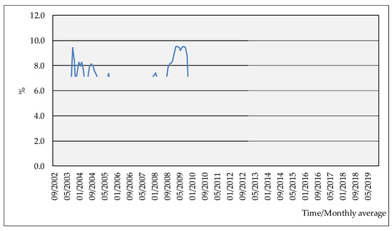 Six-month ZIBOR, monthly average for the September 2002–December 2019 period. Source: Author’s presentation of the CNB data, official website, based on excel table e-g7b-Interest rates quoted on the interbank market (ZIBOR).