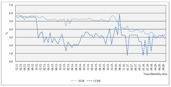 A look at Figure 6 confirms that CHF mortgage loans had lower interest rate than those in euros in most of the 2011–2020 period. Nevertheless, the standard deviation of interest rates on the EUR loans is nearly 1, while for the CHF loans it is 1.22. Thus, the interest rate risk turns out to be much higher when households take out CHF mortgage loans.