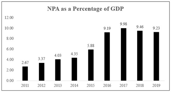 Level of NPAs as a percentage of GDP in India. Source: Data is taken from the official website of World Bank (https://data.worldbank.org/indicator/FB.AST.NPER.ZS?end=2019&locations=IN&start=2008&view=chart; accessed on February 2021).