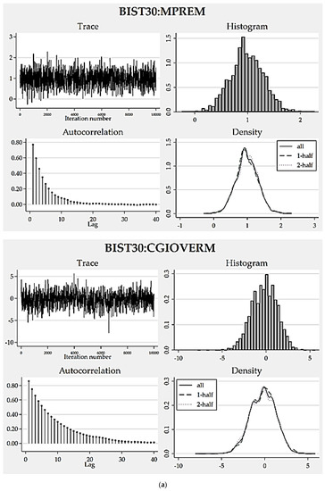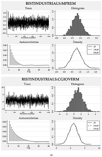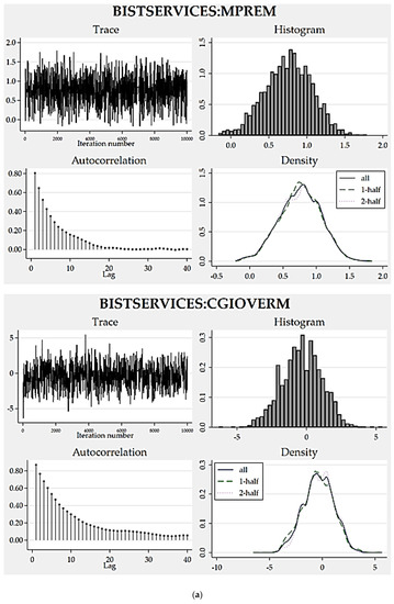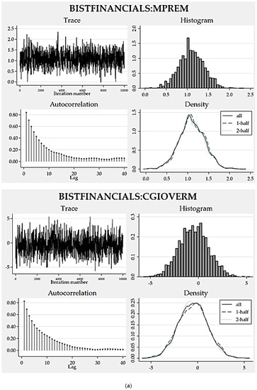 Consequently, 16 models were derived for each portfolio. Their acceptance and overall efficiency rates were considered in selecting the best model design for each portfolio from among all these Bayesian models supposing any acceptance rate close to or over 40% and efficiency percentage over 1% to be reasonably satisfactory. In this manner, the model proposals with higher efficiency rates associated with the coefficients were deemed to be superior to others. Resultantly, we have come up with a candidate as the best model design for each model version as per portfolio. At the last step, we comparatively appraised the agreed best model designs to decide on the most prosperous model version. Then, we analyzed the efficiency scores and convergence graphs for the best-version model to judge its accuracy and validity. Through the credible interval hypothesis tests, the appropriateness of the posterior distribution proposed by the model was examined together with a standard coefficient estimate for every predictor.