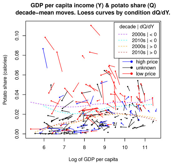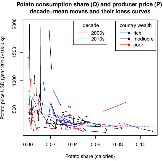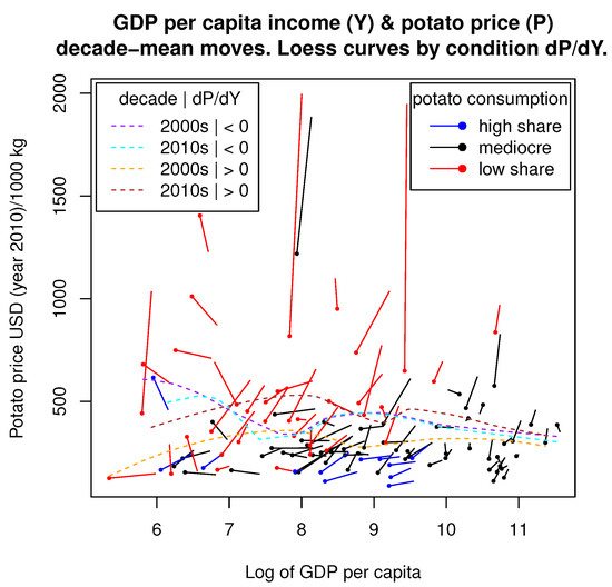 Producer price data for potatoes is relatively scarce in FAO statistics, and we will double the number of areas studied by ignoring its absence. As potato consumption share relates to potato price, as we saw in Figure 1, it is possible and also more interesting to continue the study including this other half of potato related observations, although they are missing actual price data. Thus, the remainder of this study discusses potato consumption share against GDP per capita. Figure 3 relates that, especially for less developed areas, potato consumption share tends to increase with rise in GDP per capita, whereas, for richer areas, increasing GDP often leads also to lowering of potato consumption share. It also seems that a turning point exists where increased development can make the potato an inferior good but—counteracting this inferior good trend—refined uses which appeal to wealthier people will emerge with development; noticeably, richest areas do not have very low shares. With similarity to our earlier observation in Figure 2, we notice here also that, for developing countries, the signs of the drawn slopes in individual FAO-area data are consistent by the condition dQ/dY cross-sectionally in local regressions. On the contrary, for the richest countries, the local regression curves are rising where they use endpoint data consisting of descending decade-mean moves and descending where they use data consisting of rising move endpoints.