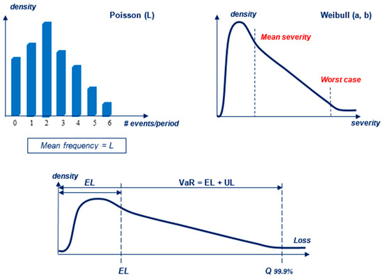 The logic of the actuarial approach is to consider separately the distribution of the number of occurrences within a certain time horizon (frequency) and the distribution of the impact of the single event in that period (severity); and then proceed at their convolution to get a unique distribution, the loss distribution, to be cut at the preferred quantile to get the Value at Risk (VaR) at the desired confidence level (Diebold et al. 2000). According to this approach, expected loss-EL is the expected value of the potential loss distribution, while unexpected loss-UL is the difference between the quantile at 99.9% (Value at Risk) of the loss distribution and the expected value of the same loss distribution (EL). It evaluates the degree of dispersion of the distribution in relation to its average value (mean), so it can be considered as a risk measurement (Guillén et al. 2007 and Jobst 2007).