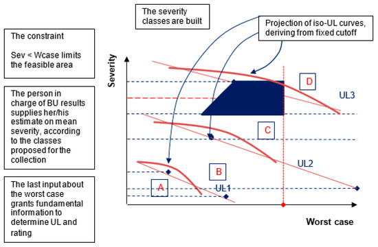 This aspect is important because it strongly reduces the relevant interval to be considered for severity during the analysis, allowing focusing the limited number of severity classes to be proposed to the interviewee. Once the relevant range of severity has been determined, the criteria for the determination of the severity classes need to be defined. Severity classes depend on the calibration linked to the size of the unit and on the first answer given to the mean expected frequency for the loss event. In the definition of these division criteria the first choice is related to the number of severity classes to be proposed to the interviewee to collect the subjective estimates. The number of classes adopted has to be sufficient to be able in discerning between the different rating classes (the OpRSA SW was parametrized with 8 rating classes); this number is constant, independent from the frequency answer. Once the number of classes to be used has been set, starting from the intersections of the iso-UL curves and the constraints, the identification of the boundaries of each class can be performed in the following way which summarizes the abovementioned criteria: we only keep the three main thresholds deriving from the intersection of the iso-UL curves with the bisector (mean severity ≤ worst case), and are kept together with the lowest threshold given by the intersection of the first iso-UL curve with the lowest constraint. The criteria to be followed for the definition of the questions on worst case also need to be defined. The only estimate on the mean severity does not allow to get a full description of the whole distribution of the impact of the single event. This third estimate makes the problem fully determined, allowing a precise identification of a finite area characterizing the set of collected answers (frequency-mean severity-worst case). The intersection between the mean level of the chosen severity class and iso-UL critical curves identifies the thresholds to be proposed for the question on the worst case.