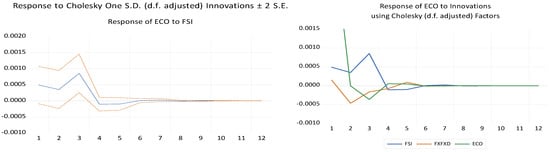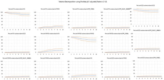 The off-diagonal elements of the estimated variance–covariance matrix is not zero; therefore, a contemporaneous correlation between the variables in the VAR model would exist. In this study, the IRFs consider some restrictions on the VAR errors to address possible contemporaneous correlations that residual impulses ignore: the Cholesky decomposition method. The Cholesky decomposition method isolates the structural errors by recursive orthogonalization. Further information on contemporaneous relationships can be introduced to the FEIR by simply multiplying it by a matrix F: