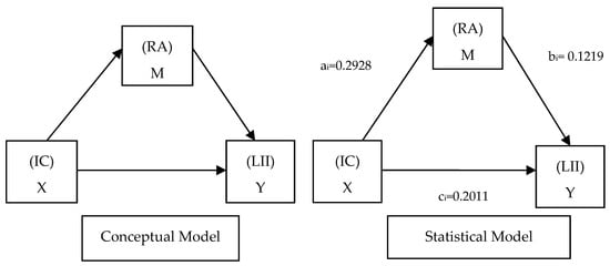 The composite effect of the IC and RA on LII is 41%, as the R square value is 0.4147 and is significant, as shown in Table 11. The individual path coefficient for the portion of modelsis0.2009 for IC and 0.7312 for RA, which are significant, as the zero values do not fall between LLCI and ULCI, as shown in Table 12.