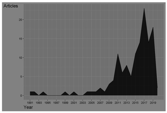 It was noted in Section 2 that the literature related to intrapreneurship has its origin in the 1970s, but it was not until the 1980s that it gained a greater force. However, the results of the bibliometric analysis suggest that papers related to the subject of intrapreneurship and corporate entrepreneurship in high-impact scientific repositories began to appear in the early 1990s. However, the growth of scientific contributions was low, with only one to three papers per year until the period 2010 to 2020, when the average number of titles with reference to the topic grew by an average of 8.1% per year. As shown in Figure 1.