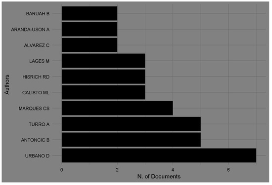 In addition, the authors who contribute most to the generation of theory on intrapreneurship include: Urbano, Antoncic, Turró, Marques, Calisto, Hisrich, Lages, Alvarez, Aranda-Uson, Baruah, Bulut, Duobiene, Farrukh, Ferreira, Franco, García-Morales, Genedy, Guerrero, Hadad, Hughes, Kraus, Kuratko, Linder and Mansori. The participations of the 10 most representatives are illustrated in Figure 3.