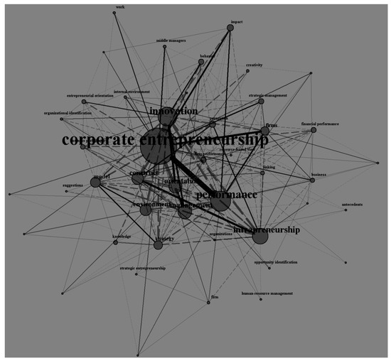 In terms of the most frequently used keywords in the scientific articles, the following were found: intrapreneurship, corporate entrepreneurship, innovation, development, models, orientation, orientation, construct, management, companies, financial development, development, strategic management, among others. The co-occurrence relationships of the keywords are illustrated in Figure 4.