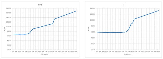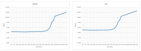 Presenting four DJIA firms: Walmart, Coca Cola, Nike, and J&J. Figures show their optimal capital structures as their debt-ratio increases.