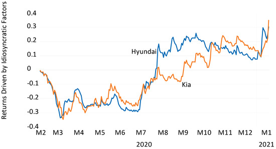 Stock returns for Kia Motors and Hyundai Motors driven by idiosyncratic factors during the COVID-19 crisis.