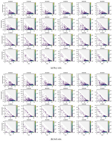 Two-dimensional histograms of times at which buy (left) and sell (right) market orders were placed (horizontal axis) and durations between the time at which a market order was placed on one side and the time of the next market order on that side (vertical axis). Data: All contracts with hourly delivery in Q2/2015. For each contract the time at which trading ends is set to the time at which trading ends for the hourly contract with delivery start at 21:00:00 UTC.