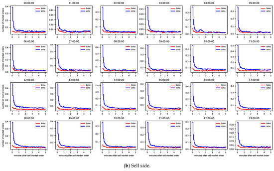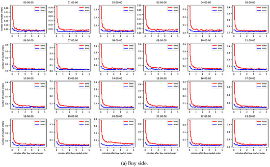 We limited our empirical analyses to buy and sell MOs. In regards to the buy side, we consider the time at which sell LOs executed by a buy MO were removed from the LOB to be the timestamp of that MO. On the sell side, it is the time at which buy LOs executed by a sell MO were removed from the LOB. The time at which an executed LO is removed from the LOB is usually around 10 milliseconds after the time of arrival of the MO. We consider all MOs for contracts with delivery start at the same full hour of the day together, not just those for the same contract, even though our results in Section 4.1 imply that considering the MOs for each contract individually is more promising. The reason is that the number of MOs per contract is typically too small for our empirical analyses to be meaningful. We are convinced that the results of our empirical analyses are also informative with regards to the per-contract consideration.