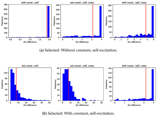 Histograms of AIC differences conditional on whether the best model is the one with self-excitation (left) or the one with self and cross-excitation (right). Cases where the AIC difference of the model with self- and cross-excitation is greater than the maximum are removed from the data.