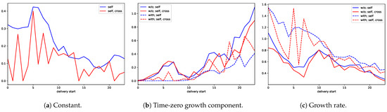 Let us also address the question whether the parameters exhibit patterns which depend on the delivery hour of the contract. To do so, we plot the median of the constant, the time-zero growth component, and the growth rate of the baseline intensity conditional on the hour of delivery start. Given that statistical evidence against equal parameter distributions is not found when comparing the different market sides, we only distinguish between models without and with constant in the baseline intensity and models with self-excitation and those with self- and cross-excitation. The results are shown in Figure 4. The median constant of the model with only self-excitation is on a rather high level between midnight and 4 am, peaks between 5 and 6 am, and then decreases to a level which is well below the one at the beginning of a day. For the model with self- and cross-excitation, it is more difficult to identify a pattern because less data are available. The median time-zero growth component of the model with only self-excitation grows with increasing delivery start and exhibits a short decline between 7 and 10 am. This decline goes along with an increase of the growth rate which is otherwise decreasing. That means the later delivery starts, the less market participants tend to concentrate their activity in terms of placing MOs on the time shortly before the end of trading.