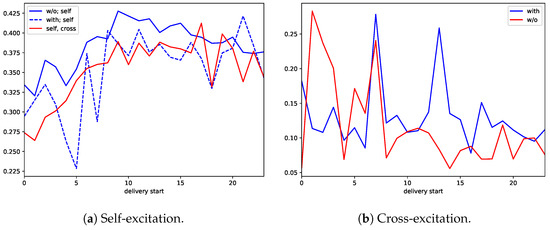 If the intensities of the point processes would only consist of these baseline intensities, the expected number of arrivals in would be 63.75, 60.56, 56.71, and 55.65, respectively. We consider both the case of presence of self-excitation and the case of absence. In case of presence, the self-excitation is of the exponential form, i.e.,