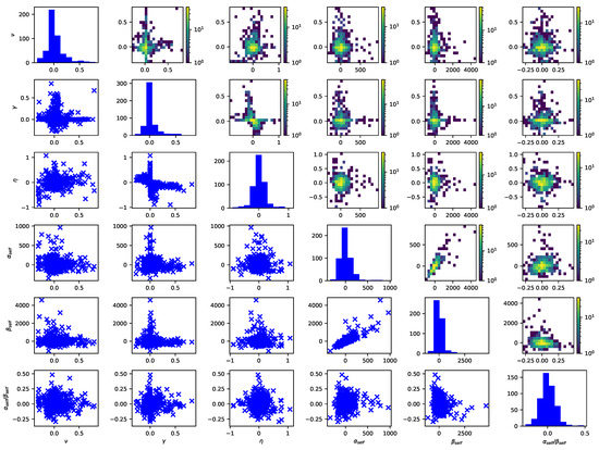Histograms (diagonal), scatter plots (lower triangle) and two-dimensional histograms (upper triangle) of the parameters of the model with self-excitation.