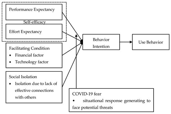 UTAUT is a well-developed model which could explain more than 70% variation corresponding to factors influencing technology system adoption (). UTAUT has been extended during the COVID-19 pandemic. Social isolation and COVID-19 fear are taken into consideration on the basis of the original UTAUT model. Social isolation is defined as the isolation caused due to lack of effective connections with others (). To prevent the virus from spreading, policies such as lockdown and quarantine have reduced interactions among people, leading to the occurrence of social isolation. Social isolation is the additional factor improving behavior intention of e-learning usage. Students who are socially isolated are positively encouraged to study online through the e-learning system (). COVID-19 fear is a situational response due to the threats of COVID-19 (). As Figure 2 shows, COVID-19 fear acts as the role of moderator factor adjusting the relationship between five factors in the UTAUT model and Behavioral Intention on adapting the e-learning system ().