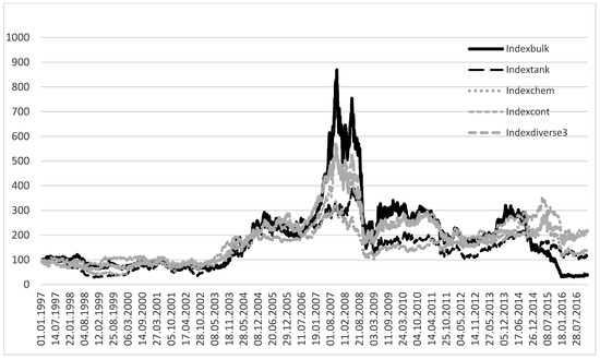 We use a sample of 102 listed shipping companies for the period 5 January 2001 to 30 December 2016 (see Appendix B.1, Appendix B.2, Appendix B.3, Appendix B.4 and Appendix B.5 for details, including names of shipping firms for each segment). We survey the listed firms under the industry code Maritime Transportation. Our sample contains all firms that are classified as shipping firms. We exclude logistics firms, warehousing firms, and passenger transport like cruise liners. Our sample represents the majority of listed shipping firms that serve manufacturing industry with needs for raw materials. Sample firms are classified into five market-weighted portfolios that represent the major sub-sectors (segments) of the shipping industry: container, dry bulk, chemicals/gas, tanker, and “others” (e.g., owners with diversified fleets). Daily stock prices for each of the companies are obtained from Eikon Datastream, denominated in USD and adjusted for stock splits. The portfolios are constructed by weighting each company in accordance with its market value, whereby the weights reflect the market capitalization of each company divided by the sum of total market capitalization within each market segment for all firms in the portfolio. The one-month US Treasury rate is used as the risk-free rate. The excess logarithmic return of each portfolio serves as our dependent variables. Figure 1 shows the price development of our five value-weighted shipping sector portfolios over the sample period (indexed to 100 at the start of the sample).