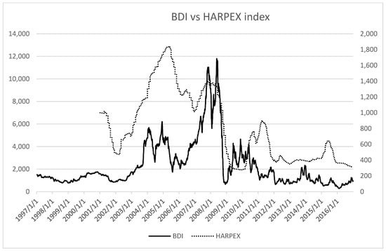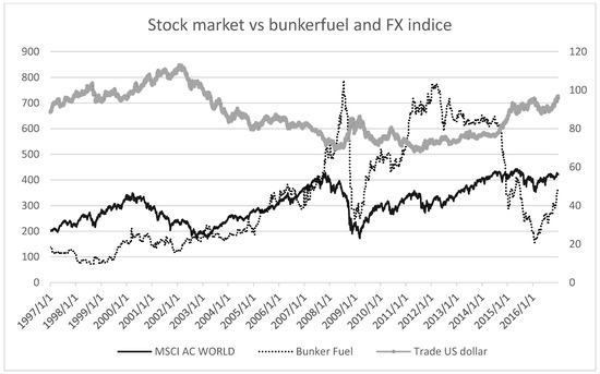 We note that previous research (Drobetz et al. 2010; Grammenos and Arkoulis 2002) uses the MSCI World Equity Index, consisting of developed markets only. The shipping industry, however, is clearly influenced also by developing markets, notably, Brazil, India, and China, such that the ACWI should be a more appropriate choice. The trade-weighted US Dollar Index is a weighted average of the foreign exchange value of the USD against major currencies, including those of the Euro area, Canada, Japan, United Kingdom, Switzerland, Australia, and Sweden. Figure 2 shows the MSCI world stock market index versus bunker fuel cost and the trade-weighted USD basket index over the sample period. Figure 3 exhibits the co-movement between Baltic Dry Index and Harpex Container Freight Index.