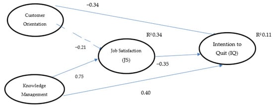 For the conceptualized direct relationships, statistical support was found for H2, H3, and H4. At β = −0.763 (p = 0.072), H2 was supported; there was a negative relationship between customer orientation (CO) and the intention to quit (IQ) at a significance level of 0.10. Thus, higher customer orientation would lead to a lower intention to quit. The conclusion of support for H2 was rationalized on the logic that due to the magnitude effect of the sample size, a conclusion based on a 10% significance level was valid (Richard 1986). Reinforcing that validity, Wasserstein and Lazar (2016) underlined that despite smaller p-values, statistical results could still be scientifically meaningful when an advanced analytical tool like AMOS is used to establish satisfactory fit indices, and this was the case in this study. For the second conceptualized relationship involving customer orientation, statistical significance was not found. At β = −0.349 (p = 0.358), customer orientation had a negative and statistically insignificant relationship with employee job satisfaction. Thus, H1 was not supported, a finding that contrasted with the prior literature, which suggested a positive association of customer orientation with employee job satisfaction (e.g., Babakus et al. 2011; Aliyu and Nyadzayo 2016).