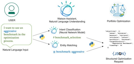 Figure 1 shows how the inputs in natural language format are processed within the cognitive portfolio optimization system. The input is first being classified into underlying intents using the intent classifier (discussed in Section 3.1), and contextual terms using the entity matching model (discussed in Section 3.2). The processed output is then stored and handled using global variables and, after all of the inputs are processed, the optimization problem is formulated using these stored values in global variables (Section 3.3) and a request is sent to the portfolio optimization service described in Section 2.2. After processing each input and receiving the result from the portfolio optimizer, a natural language response is returned to the user to confirm preferences, request additional information, and provide help and instructions. The system then summarizes the optimization preferences and results, and then visualizes the properties in the optimized portfolios while using the conversation management system (Section 3.4).