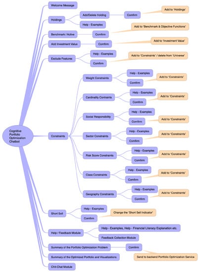 One advantage of using a chatbot as the user interface is that the interaction is easy and natural for users. This includes a warm welcome and provides instructions on the available functions and system usage, confirming the processed investment preferences and entities mentioned, asking for further information when needed, communicating the optimization settings, and sharing results with the users. To achieve this, the chatbot could use a pre-set conversation manager that controls the chatbot responses. An example of such conversation manager is shown in Figure 2.