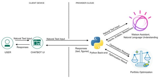 Figure 3 summarizes the overall design of the cognitive user interface for portfolio optimization. The user interacts with the chatbot user interface using natural language input and receives responses in text, voice, or visualization. This process is executed on the client’s personal device. The chatbot user interface forwards the natural language user input to the Python backend and the cloud application to be processed by the intent classifier, the entity matching model in the natural language understanding application on the cloud, and then the Python backend stores the extracted investment preferences and provides a response back to the chatbot using the conversational management system. The Python backend, natural language understanding application, and underlying optimization service applications are deployed on the service provider’s cloud.