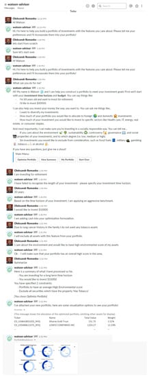 The JSON-formatted response that is returned by SS&C Algorithmics Portfolio Optimization service is post-processed by the chatbot system, and optimal positions in each instrument are saved into a csv file that can be submitted to a trading system. We also implemented a validation procedure for optimal portfolios, currently only some of the validation results are reported to the user by the chatbot. For instance, in the optimal portfolio example that is discussed in Section 4, the chatbot is able to report the objective function value (the tracking error with respect to the benchmark portfolio) and confirm to the user that the portfolio value is $10,000, which corresponds to the invested amount. ESG properties of an optimal portfolio (environmental score, sustainability score, governance score, controversy score, and social score) are also computed and visualized. In the implementation example in Section 4, it is confirmed that the portion of assets with High Environmental Score within the optimal portfolio is greater than or equal to 50%, as specified by the constraint. Other user preferences, e.g., that tobacco stocks are excluded, are also validated, and can be reported back to the user.