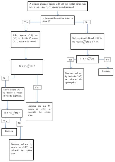 Assumming that all of the model parameters, including and , have been extracted from market data and assumming that one knows the current status of economy, i.e., we are either in State 1 or State 2, before one decides to use a regime-switching model to price an American option. Subsequently, the actual pricing exercise needs be divided into two stages, relying on the current status of economy when a pricing task is conducted. If we are in a higher status of economy, i.e., in State 2, using the obtained in Section 3.1 would be sufficient, because, in this case, once S drops below from the above, the put option should be exercised as a result of the fact that . On the other hand, if we are in a lower status of economy, i.e., in State 1, an additional PDE system may need to be solved relying on the current underlying value. For the range of , the solution that is shown in Section 3.1 can no longer be used and one needs to use the solution shown in Section 3.2, in which has already “landed” on the payoff function. This pricing procedure can be better demonstrated with the following flow chart, see Figure 1.