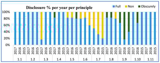 Although King IV was not yet issued in 2015, it is important to note that some principles were already being implemented by the sampled universities as King IV was an expansion and improvement of previous King codes. As shown in Figure 2, in 2015, 100% of sampled universities disclosed principle 1.4 compared to 100% and 83% of sampled universities in 2016 and 2017, respectively. In addition, 80% of sampled universities disclosed principle 1.5 compared to 83% in both 2016 and 2017. Relating to the approval revision and approval of policies as outlined by principle 1.6, the results revealed 60% disclosure by the sampled universities in 2015 and 83% in 2016. King IV was introduced, and #Feesmustfall started in 2015. Therefore, most universities in 2016 strengthened their policies and procedure, though the disclosure declined to 66% in 2017. Additionally, the years 2015 and 2016 displayed a higher nondisclosure relating to principle 1.7 as 80% and 83% of sampled universities did not make disclosures in the respective years. This is due to the requirements of developing and approving risk appetite and tolerance level only coming into existence in 2016. Therefore, most universities had not adopted compared to 2017, where it was only 50% nondisclosure.