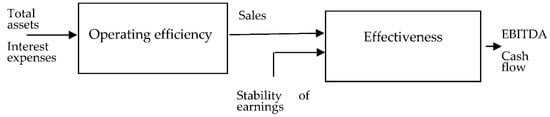 The independent approach (Koronakos 2019) for the DEA assessments is used (i.e., each stage is handled separately), and thus the performance of each stage (operating efficiency, effectiveness) is measured separately. In stage 1, a DEA performance metric for measuring firm performance in terms of operating efficiency is used. That is, a company is considered efficient in achieving its goals if it generates monetary results (total revenue or sales) with the least amount of total assets and interest expenses. The objective of stage 2 is to measure DEA-based effectiveness and success at this level can be interpreted as a company’s earnings and cash flow generation compared to sales and stability of (net) earnings. In stage 2, the sales (i.e., the output of stage 1) together with stability of earnings are treated as inputs where earnings before interest, taxes, depreciation, and amortization (EBITDA) and cash flow are the outputs. This two-stage structure, i.e., operating efficiency (stage 1) and effectiveness (stage 2), is illustrated in Figure 1. The selected variables are discussed in detail in Section 3.3.
