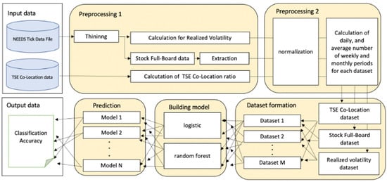 Figure 1 shows the entire process of the experimental procedure. First, we processed the raw datasets used in our research: NEEDS Tick Data File, which contains a stock full-board dataset and market volume dataset and the TSE Co-Location dataset, which contains HFT information. In preprocessing 1, the NEEDS Tick Data File, which is the high-frequency dataset, is thinned to reduce market micro-structured noise; then, we calculate RV and organize the stock full-board dataset. For the TSE Co-Location dataset, we calculate the ratio of all transactions traded from the TSE Co-Location server. By doing this preprocessing, we can determine the approximate effect of HFTs in the entire Japanese stock market. In preprocessing 2, we perform standardization so that different sizes of data can be analyzed in the same explanatory variable space. In addition, considering investors with various investment horizons, following the HAR model, we calculate the previous day data and the average of the past data (weekly and monthly, which correspond to 5 and 22 working days, respectively) for each variable to put in the explanatory space to predict RV.