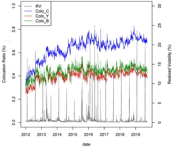 Time series of the TSE Co-Location dataset and RV. In this figure, RV denotes , while Colo_C, Colo_Y and Colo_B denote co-location ratios; the ratio of order quantity via the TSE Co-Location area to total order quantity (defined in Equation (5)), the ratio of execution quantity via the TSE Co-Location area to total order of execution quantity (defined in Equation (6)) and the ratio of the value traded quantity via TSE Co-Location area to total value traded quantity (defined in Equation (7)), respectively.