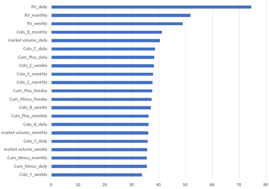 The order of important variables helps us gain an in-depth understand and confirm the important variables. This information is especially beneficial for practitioners because they have to explain the content of the model to customers or supervisors. The random forest method generates the importance of each variable. This visualization is one of the advantages of the random forest method. Figure 3 shows the importance variables arranged in descending order based on the Gini index in the building process of the HAR + Volume + TSE Co-Location + Stock full-board model. Thus, we know that RV_daily is the most important variable in this model. RV_monthly and RV_weekly are the second and third most important variables, respectively.
