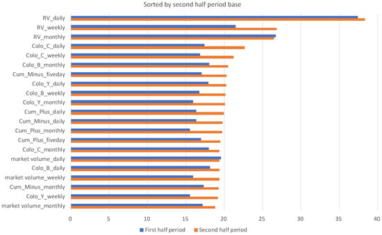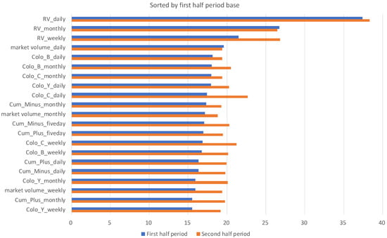 To examine the effect of the TSE Co-Location, we split the total observation period (1 March 2012 to 31 October 2019) into two periods to consider the effect of Arrowhead renewal in 2015: the first half period (1 March 2012 to 23 September 2015) and the second half period (24 September 2015 to 31 October 2019). For each period, we build a model in the same framework as in the previous sub-sub section to compare the differences in important variables between the first and second half periods from a time-series perspective. Figure 4 and Figure 5 show the important variables in the first and second half periods, sorted in descending order based on each period. Considering the changes in the importance of variables, RV remains an important variable in both the first and second half periods. However, in the categories excluding RV, the importance of the TSE Co-Location dataset increased overall and ranked higher from the first half period to the second half period. In particular, the increase in Colo_C was remarkable. Colo_C occupies the second position in the second half period, following RV. Colo_B ranks in the top three, but this category is less important in the TSE Co-Location dataset than in the first half period. This suggests that information on the order status of HFT among market participants is more valuable than that of what is bought or sold. It is interesting to recognize this trend as an increase in HFTs. In contrast, Colo_Y was not as important in both periods. In fact, remember the flow of order → execution → trading volume, when an order is filled, that number is reflected in the trading volume. From this, we think that it is possible to interpret that Colo_Y is not an important variable because it has a strong meaning between order and trading volume.