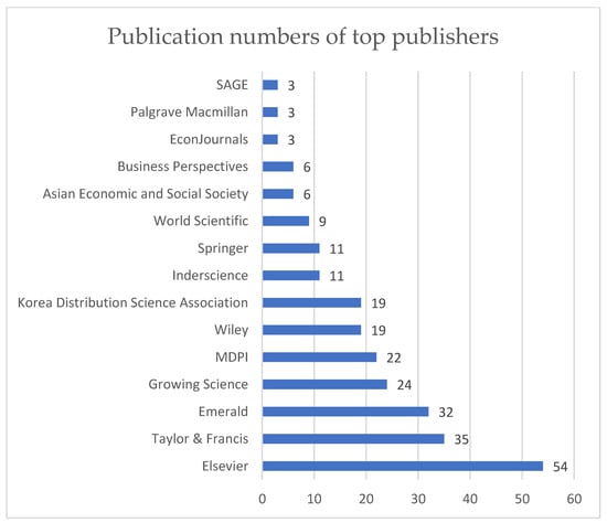 The following figures and tables will demonstrate our final sample’s characteristics. The final dataset consists of 9 conference proceedings, 7 book sections, and 226 scientific journals with JIF ranging from 0 to 4.803 (see Figure 1). In addition, Figure 2 displays a list of top publishers in the dataset. It also addresses 14 fields, many of which are very prominent for future research (Environment/Sustainability, Sociology, Healthcare, etc.) (see Table 1). With the scope of only one financial market, this dataset is relatively comprehensive compared to other systematic review papers (; ; ).