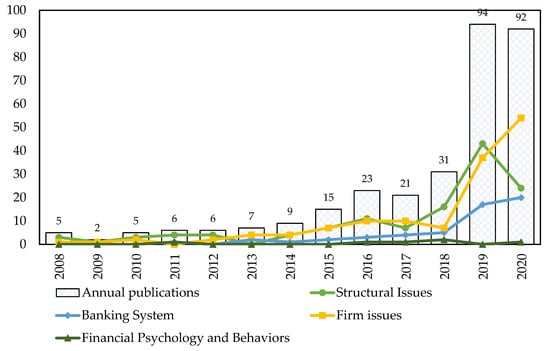 We categorize the articles mainly into four (4) larger themes: (1) Structural issues, (2) Banking system, (3) Firm issues, and (4) Financial psychology and behavior. The results are discussed as follows. One article may aim to provide answers for multiple problems, and thus, it could be categorized into different themes (see Figure 2).