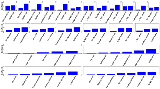 The goal of this subsection is to quantify the relative predictive power of various state policies and disease severity measures in forecasting local economic contractions. We hypothesized that the adverse effects of state policies and disease severity on local economies are not homogenous. In order to evaluate the predictive utility of our target variables in forecasting local economic contraction, we utilized a machine learning approach. We chose machine learning because prediction and classification are the domains in which machine learning algorithms excel. Machine learning models are performance-driven with a focus on the predictive power as well as classification accuracy and stability, based on known properties learned from the training samples. Table 6 presents the performance metrics of the classifier performance obtained for each model. Figure 1 illustrates the feature importance rankings derived from the classifier’s coefficients.