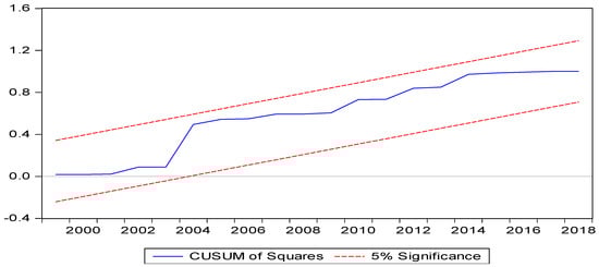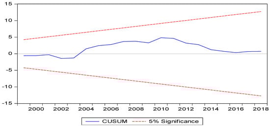 Figure 4. The ARDL cointegration is applied to observe the coefficient’s stability. All the figures illustrate that the assessed line is reasonable and within the critical boundaries at a 5% significance level. Thus, models are found to be reliable and stable after estimation.
