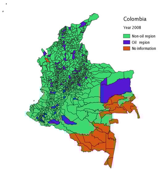 Colombia is composed of 32 regions (or departments) with 1122 municipalities. Each department and municipality are under the supervision of a governor or mayor, respectively. I used panel data on 1093 municipalities for the 2000–2010 period. The Center for Studies on Economic Development (CEDE) at the University of the Andes consolidated municipal level data into a single database. Data includes variables on general characteristics of municipalities, fiscal variables, oil endowments, time-series data on international oil price, geo-information (to create a spatial weight matrix), and conflict data.