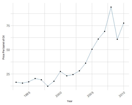 In regression analysis, municipal-level panel data for the period 2000–2010 was used. These data have been already used to analyze spending interaction (Fossen et al. 2017), the effect of fiscal decentralization (Soto et al. 2012), income shocks (Dube and Vargas 2013), political stability (Acemoglu et al. 2013b), and revenue and government performance (Martinez 2019). The variables are expressed in real per capita Colombian pesos (COP) with the base year as 2008. The dataset has high-quality local-level data with more informative variables. The dependent variables for this empirical analysis are budget balance, total public expenditure, and tax revenue per capita. The control variables are population, population squared, the fiscal transfer from the central government to the municipality, the share of the rural population, conflict (abduction)9, and municipal and year fixed effects. All fiscal variables data are expressed in real per capita Colombian pesos (COP) with the base year as 2008. The data period also overlaps with one of the most significant increases in oil prices, as shown in Figure 2.