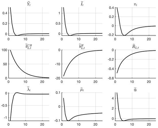 Two key parameters, and , were calibrated to replicate QE’s persistence and scale22. The BoJ announced on 4 April 2013 that the long-term bond held by BoJ would be increased from JPY 89 trillion to JPY 190 trillion from the end of 2012 to end of 2014, which meant a 113.48% increase in long-term bond holdings. Considering the inaccuracy of calibration, the was set to be 1 to simulate the effect of the long-term bond purchase by the BoJ. Other exogenous shock parameters were set to the usual values.