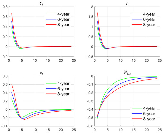 As mentioned in Section 3.1, is also considered to have a critical role in the effect of QE. Similar sensitivity analysis was conducted for two other cases, higher portfolio adjustment cost () and lower portfolio adjustment cost (), and they were compared with the benchmark case (). Results were similar to those in Figure 2, so we do not report the IRF here again. Sensitivity analysis shows that with a higher portfolio adjustment cost, short- and long-term bonds become less substitutable. The asset purchase conducted by the central bank thereby had macroeconomic effects. The effects were also amplified as increased. When , two kinds of bond were perfectly substitutable, and no effects could be generated by QE.