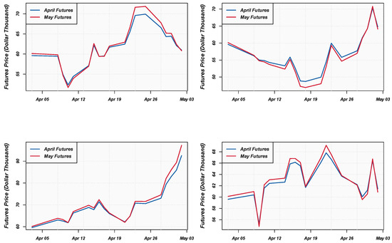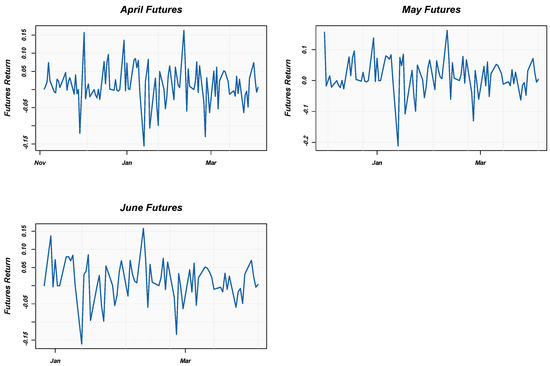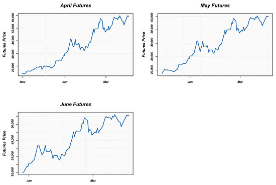 In this section, the empirical results are presented and discussed. In this study, daily data1 from 30 October 2020 to 1 April 2021 were used. The expiry dates of the Bitcoin futures prices are as follows: 30 April 2021, 28 May 2021, and 25 June 2021. The Bitcoin futures prices and returns are plotted in Figure 1 and Figure 2 below.